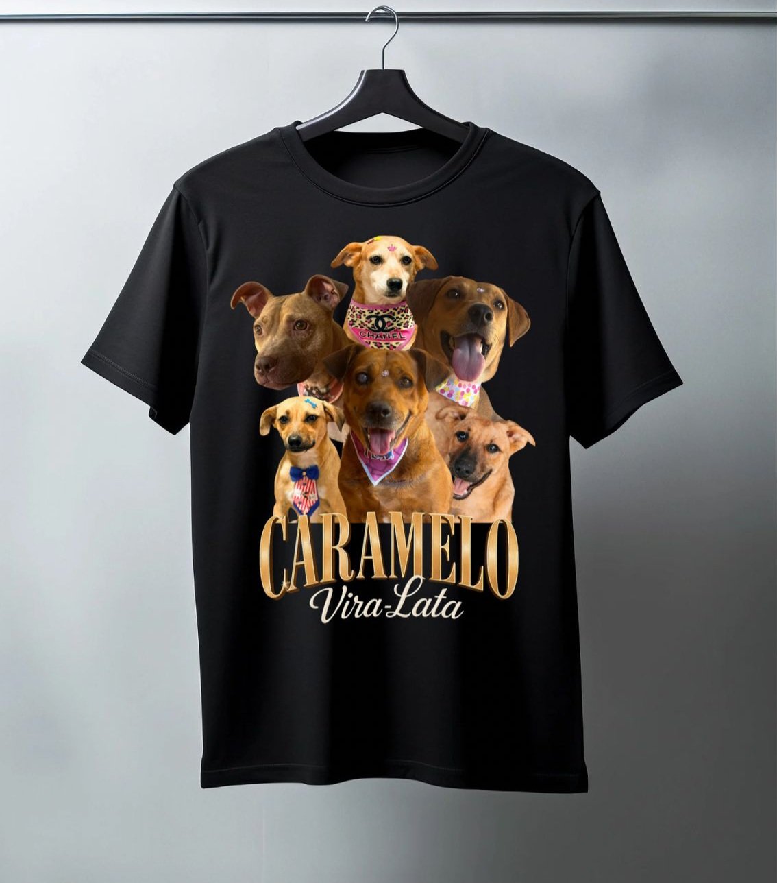 Camiseta preta, modelo caramelo vira lata, tecido poliviscose.
