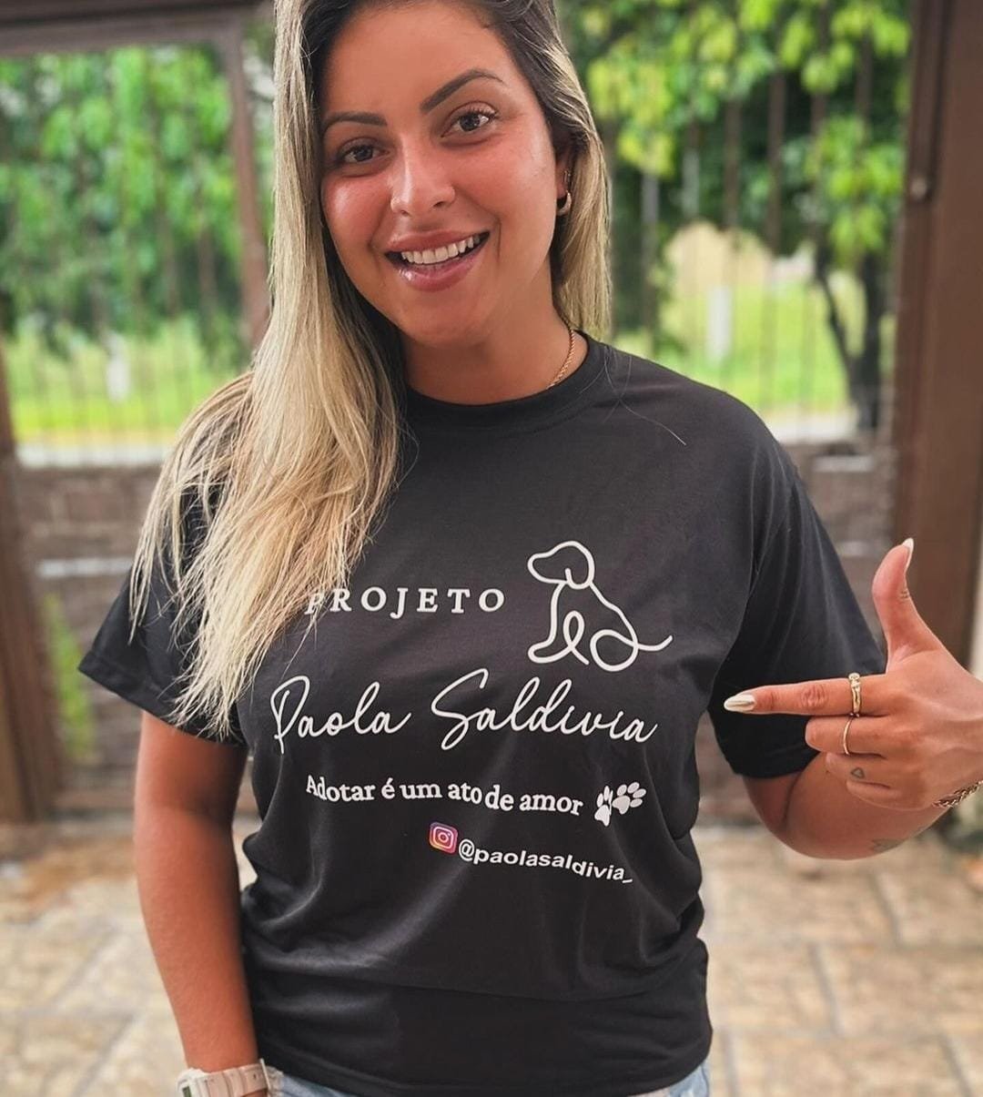 Camiseta com estampa “projeto Paola Saldivia”, tecido 100% poliéster fio 30.