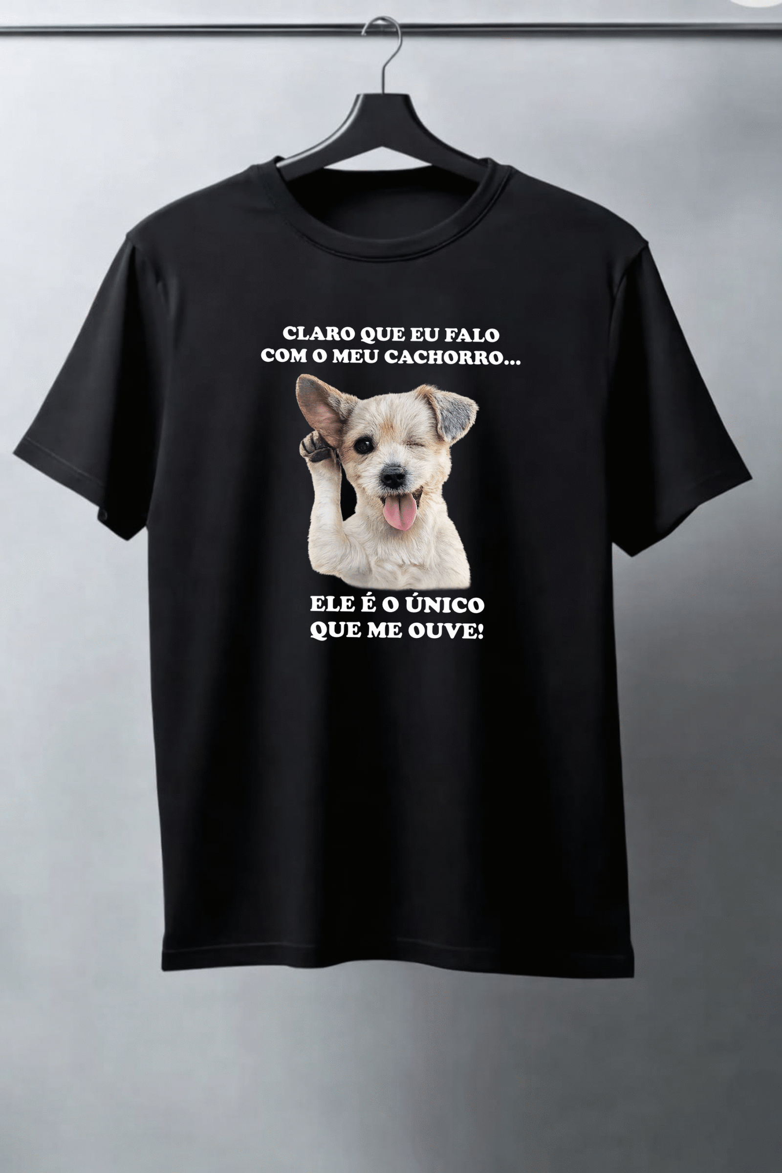 Camiseta preta em tecido de algodão, estampa em dtf.